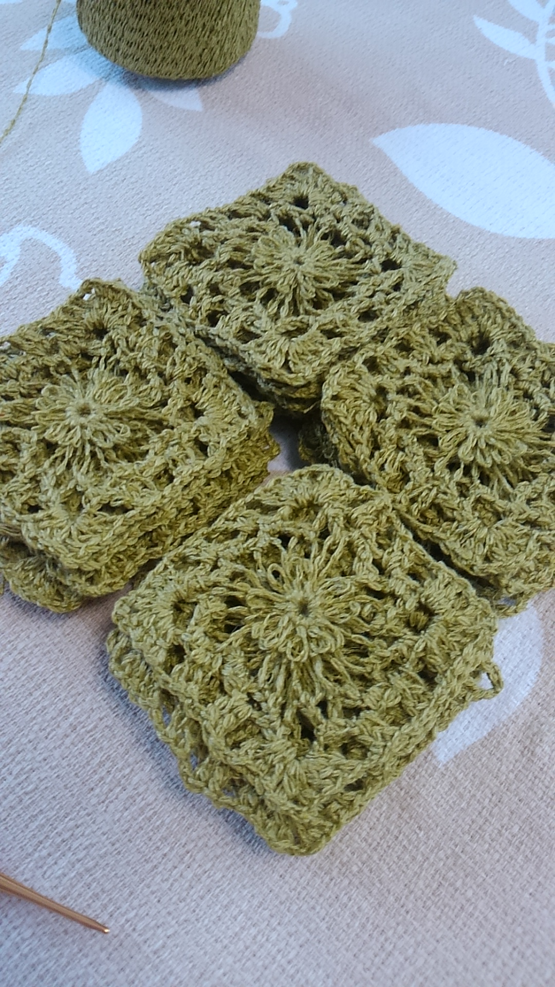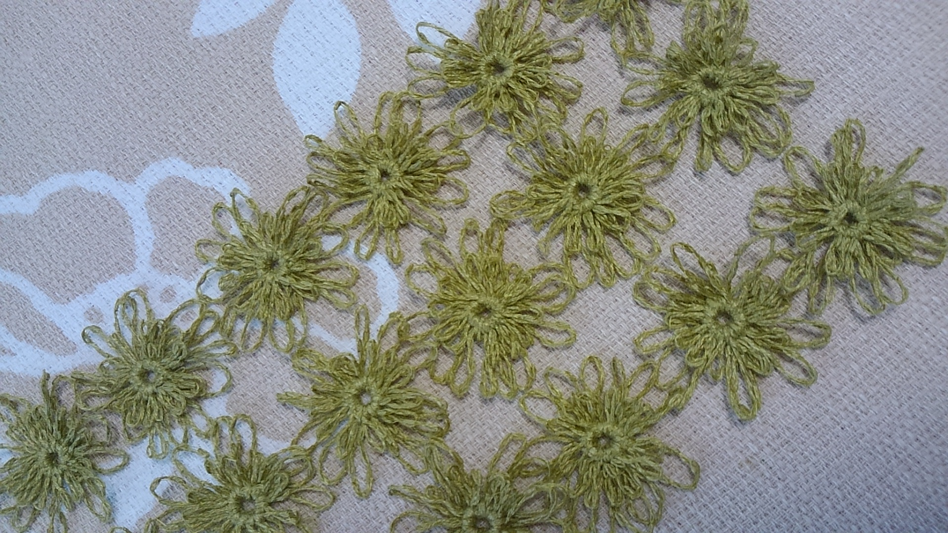 平織り58枚作成→かぎ針でネット編みをしながらつなぐ→ふちはよね編み