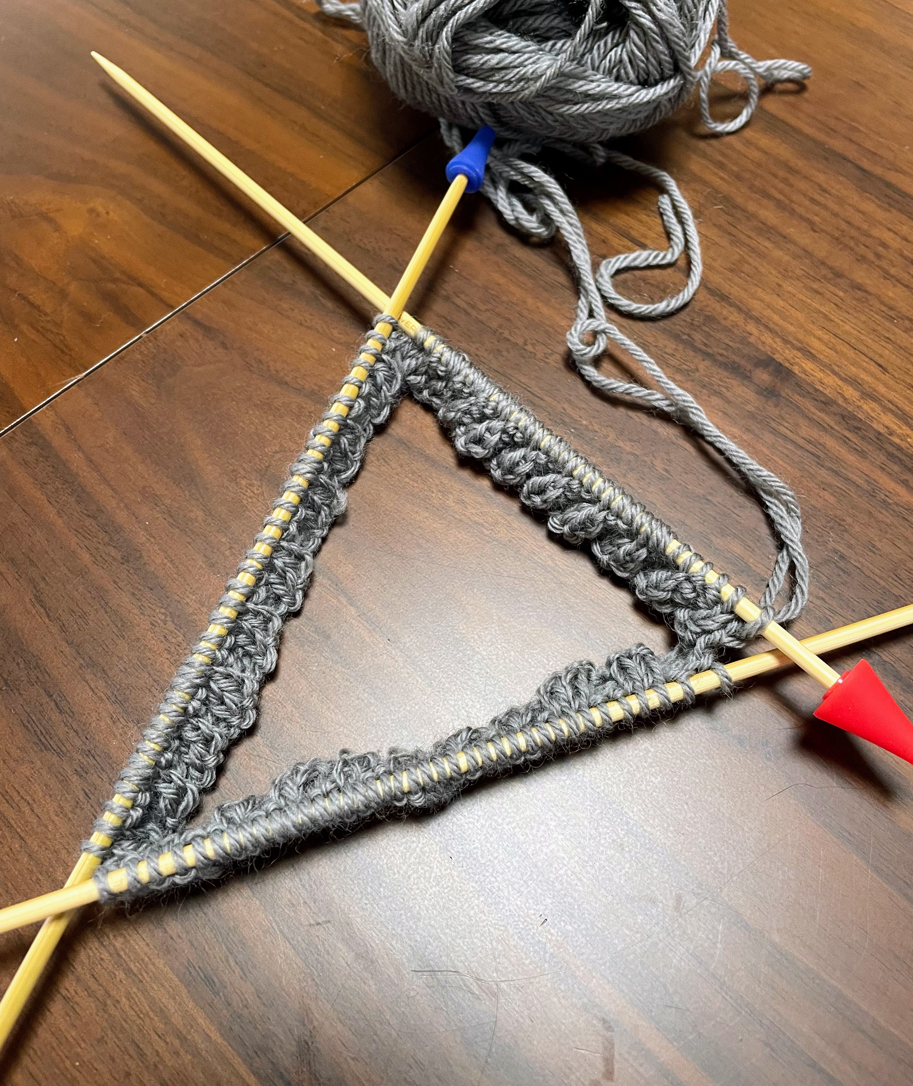 4本針でかぶり口のゴム編み→すべり目の模様編みと編み進めていく作品なのですが