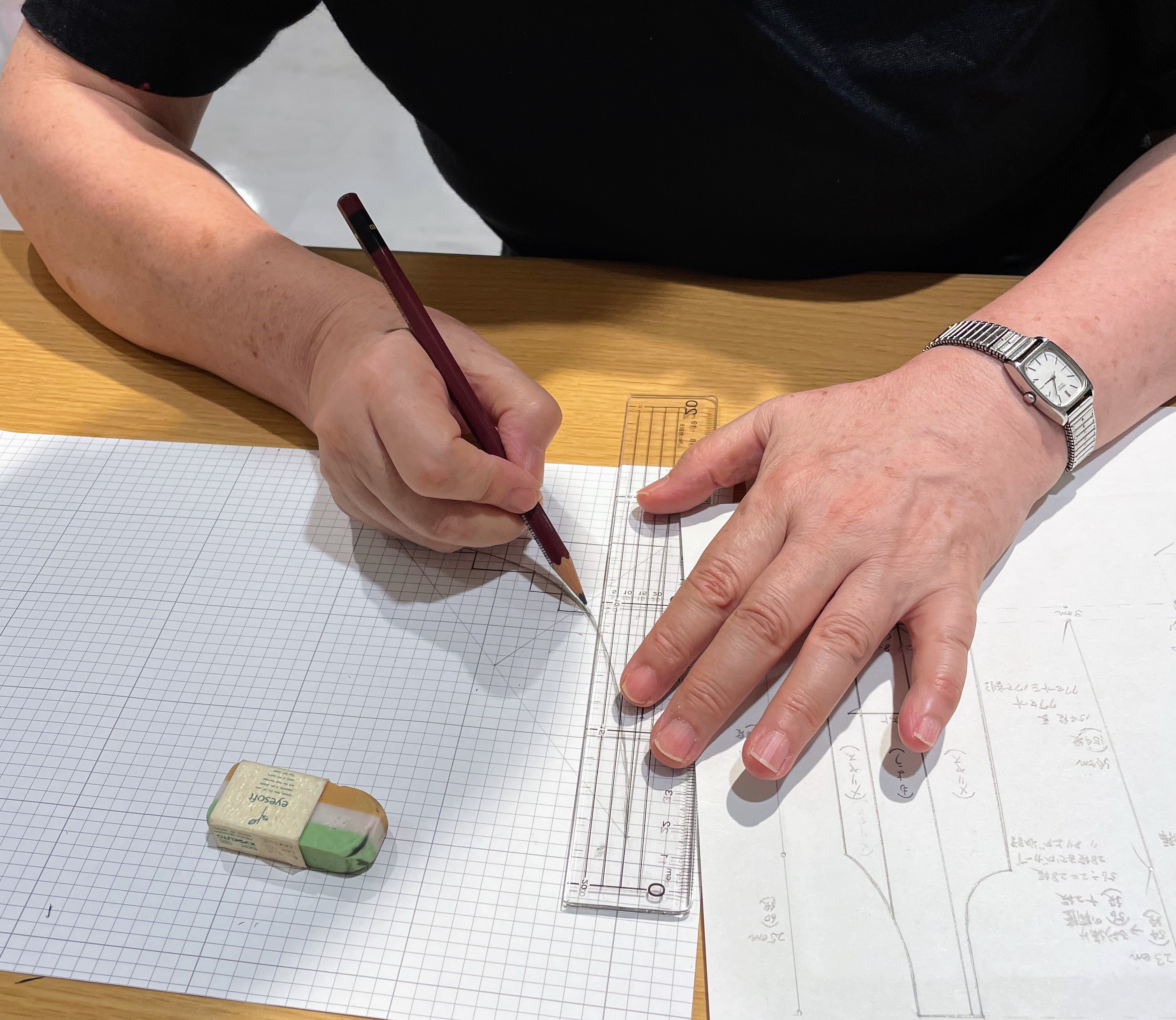 独得の方法で割り出す衿ぐりのカーブ(いわゆる「模様崩し」です)は