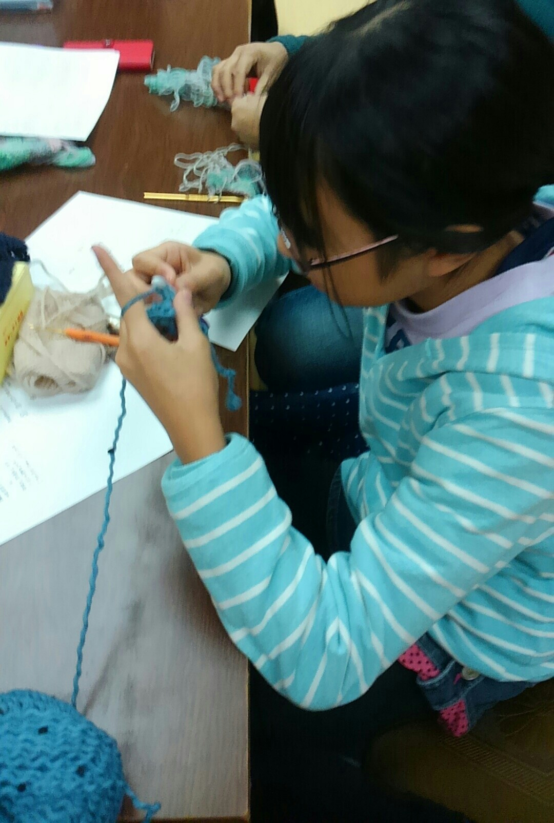 はじめてのかぎ針編みでネックウォーマーを編む小学生の女の子に、