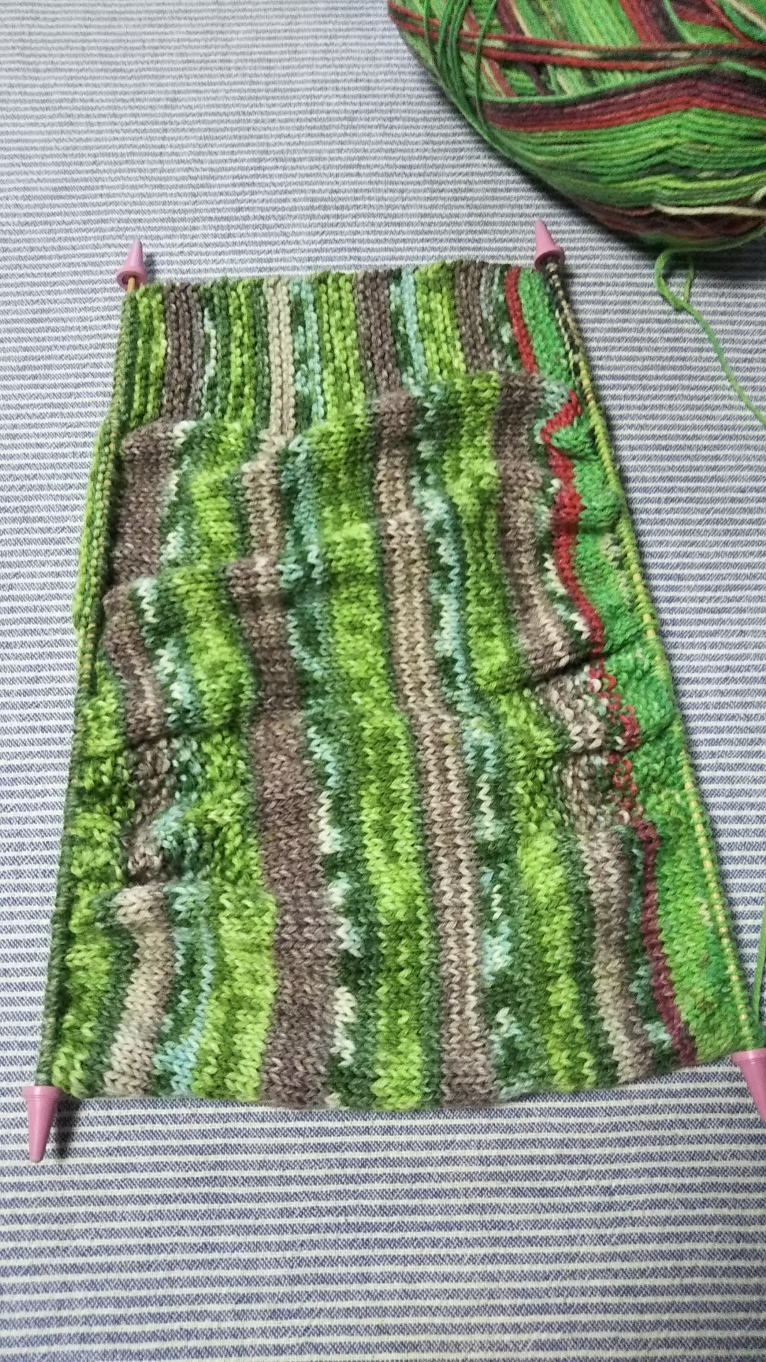 結局は左側の段染め糸で残りすべての過程を編みました)