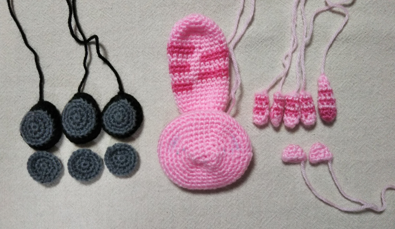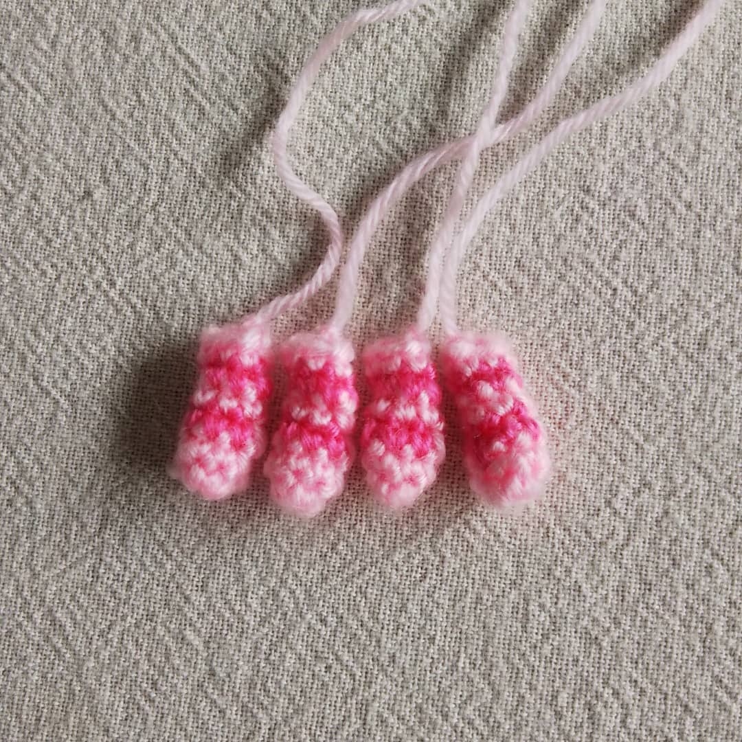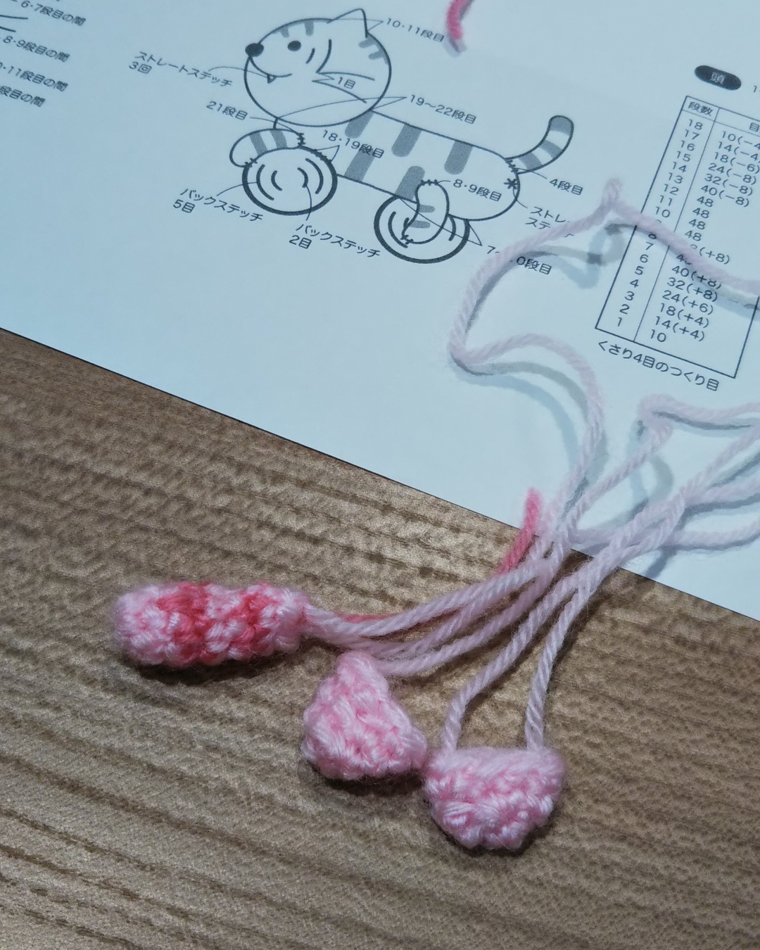 使用毛糸/アクリル100%の中細毛糸(薄ピンク、濃いピンク、グレー、黒、茶)