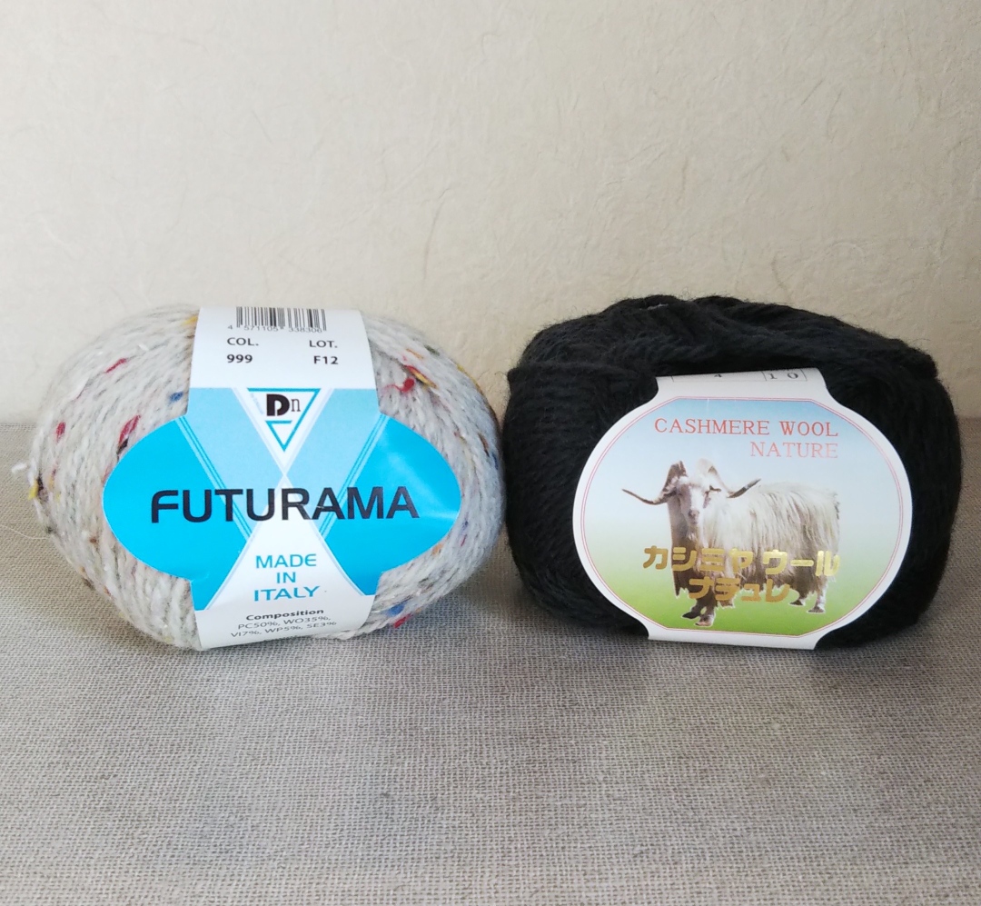 使用毛糸/カシミアウールナチュレ70g、FUTURAMA45g(どちらもユザワヤ)