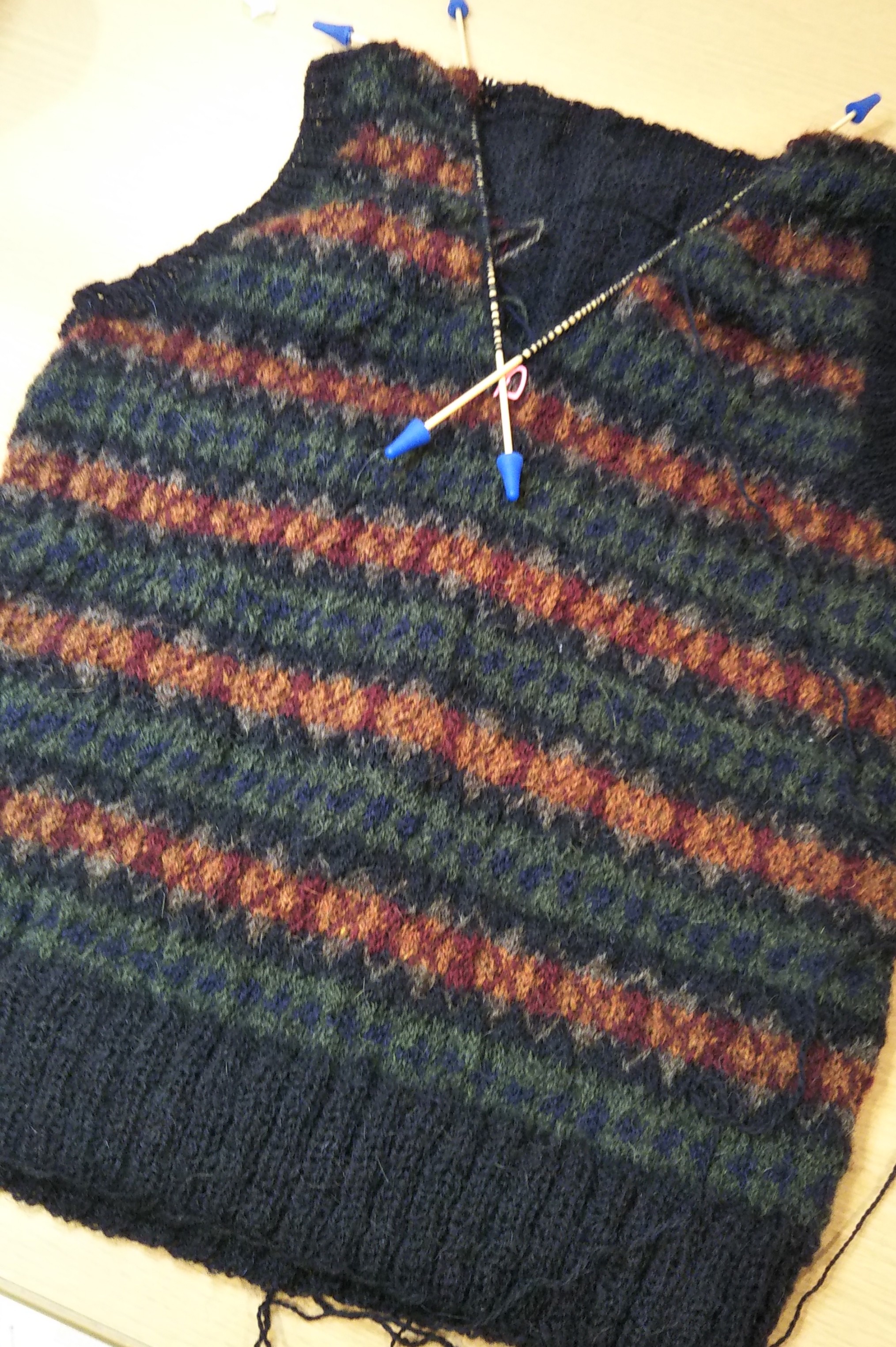 フェアアイル風の編み込みVネックヴェストに挑戦しているお方です。