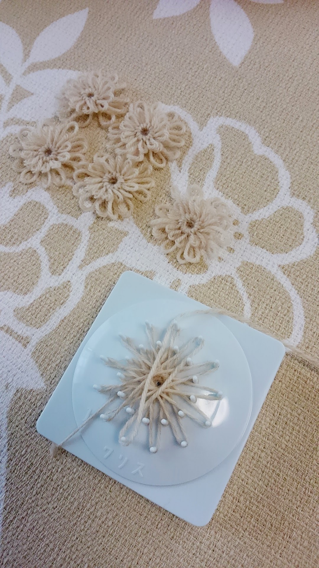 ( 織り機の内側にとじ針を立て、別の糸をかけます)