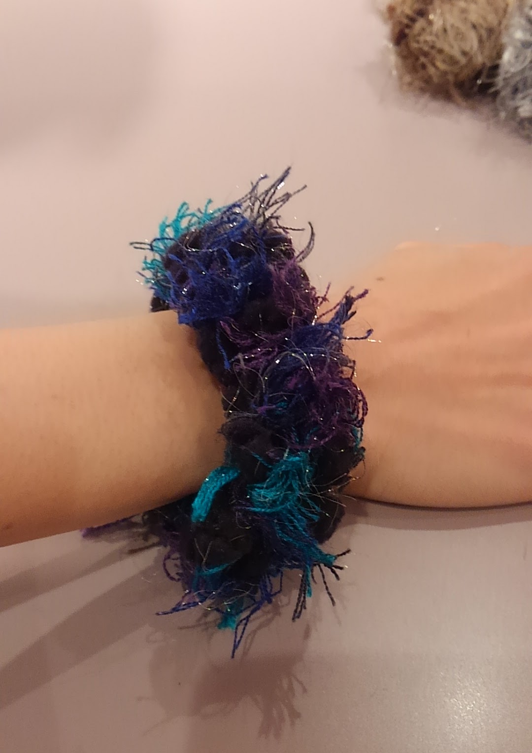 で、ささっとゆび編みのシュシュを作ってくださいました。