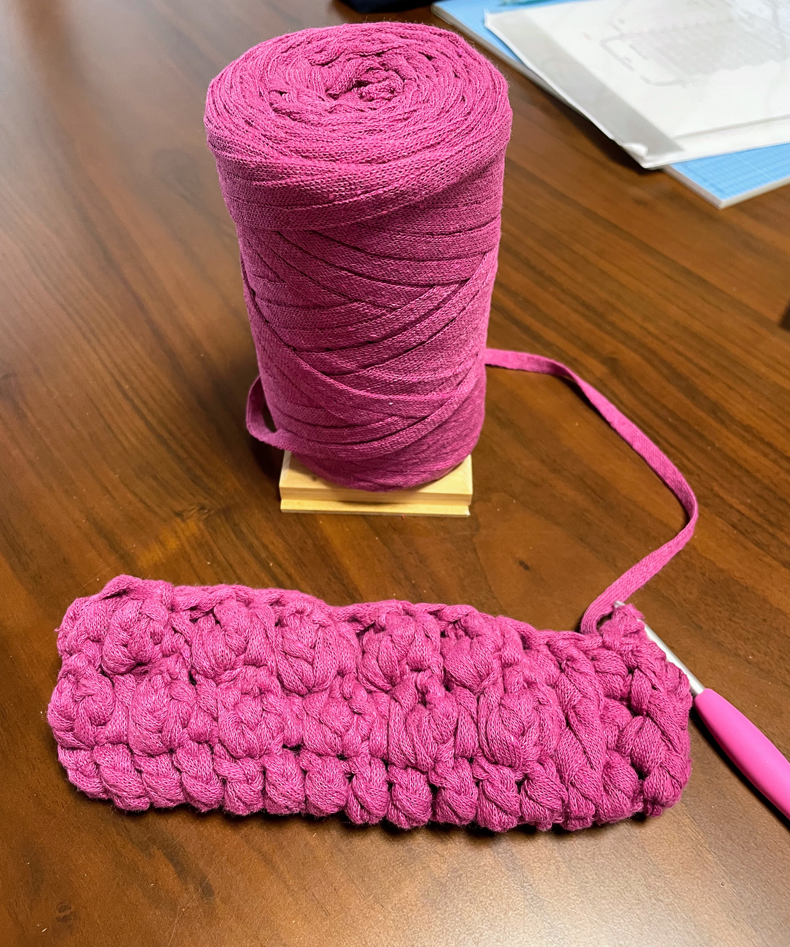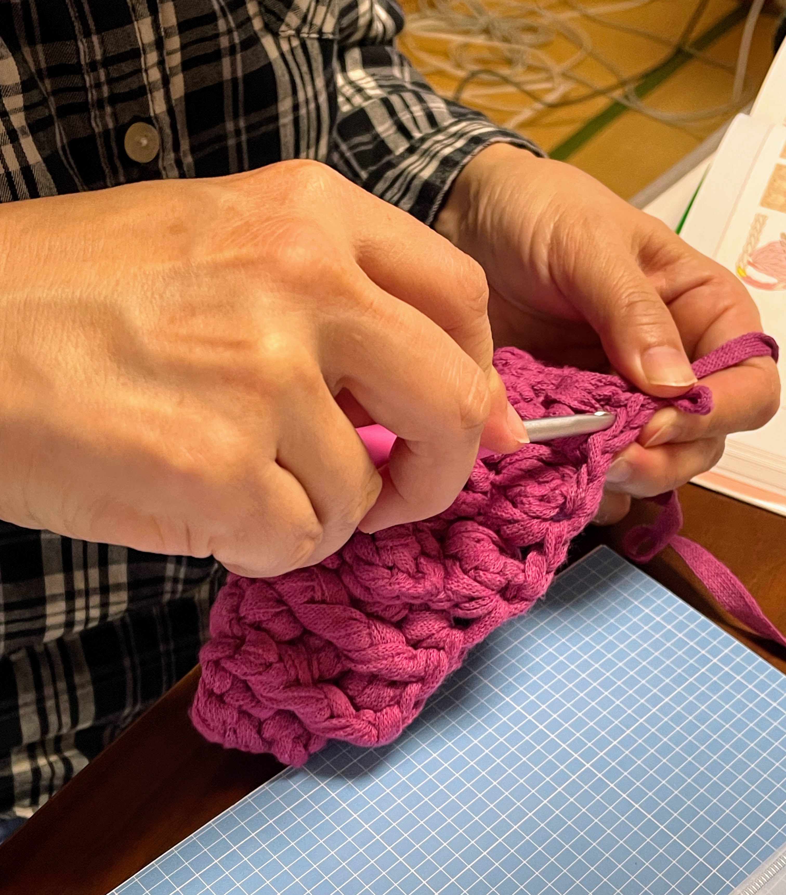 極太Tシャツヤーンでミニバッグを編み始めていただいたのですが