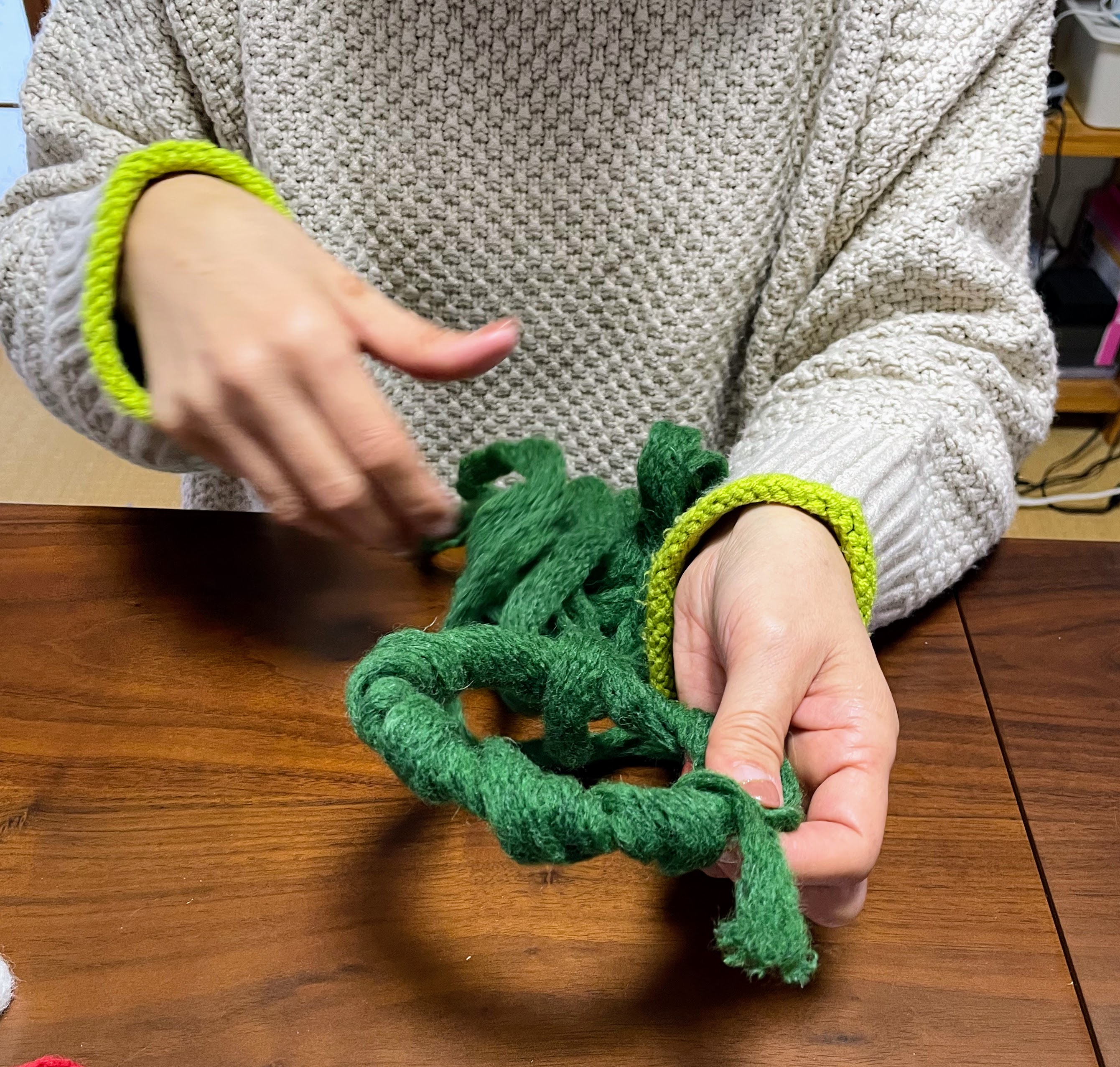 土台のワイヤーに毛糸を巻き付けたり、結んだりするだけなのですが