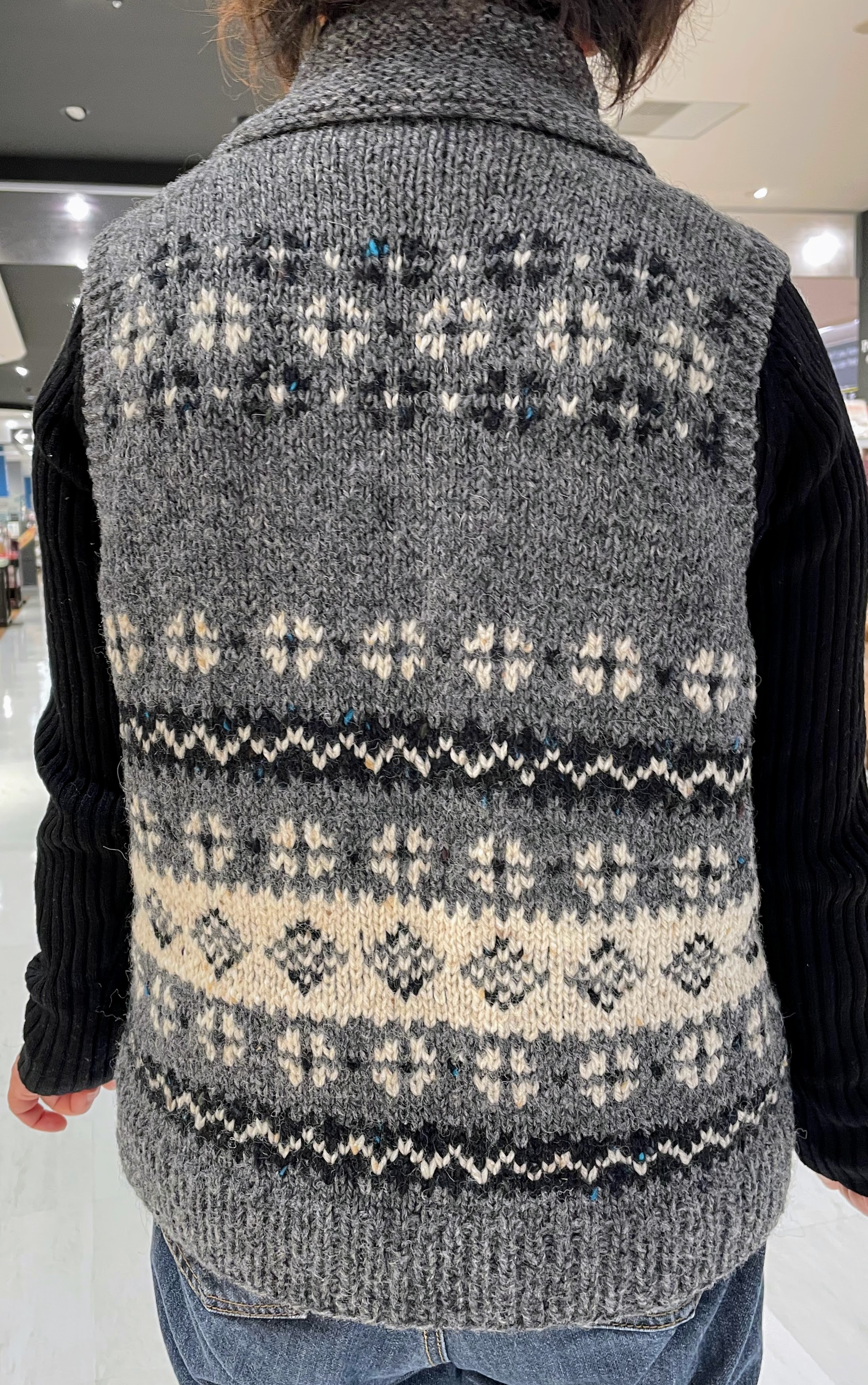 まずは、前回取り組んでいらっしゃった編み込み模様のヴェストが完成なさったとのことで
