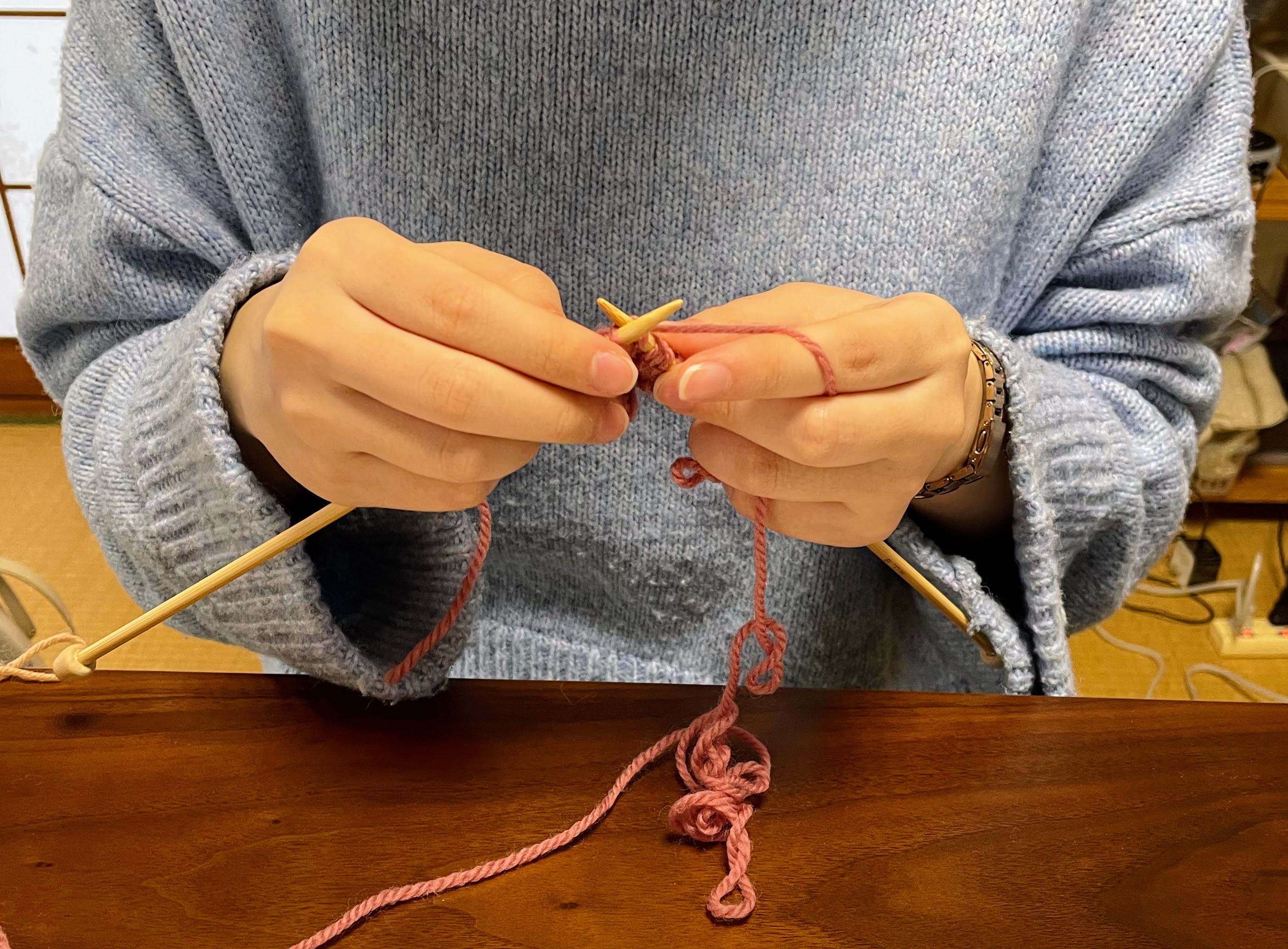 次のテーマのノット編みの模様に取り掛かっていただきました。