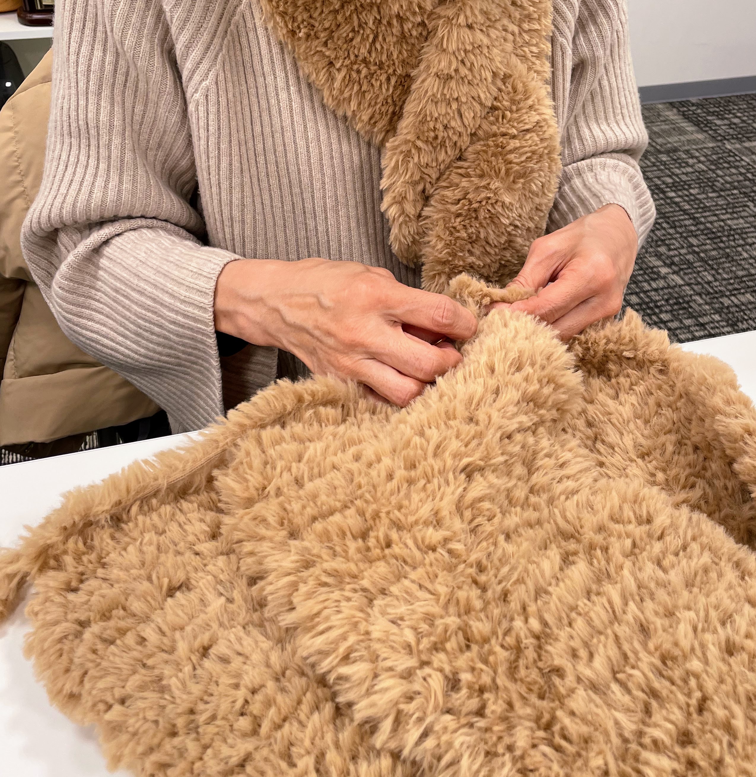 前回取り組んでくださったファーのミニマフラーは完成なさっていて、