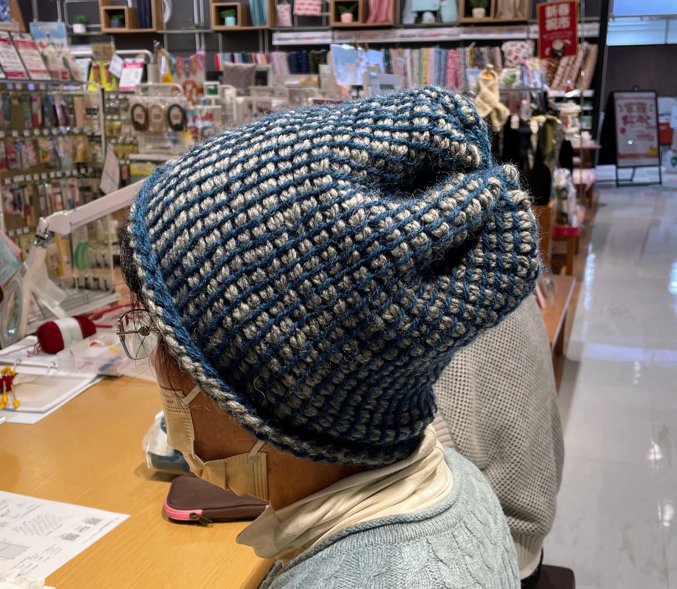 お二人目はアフガン編みの帽子のお方です。