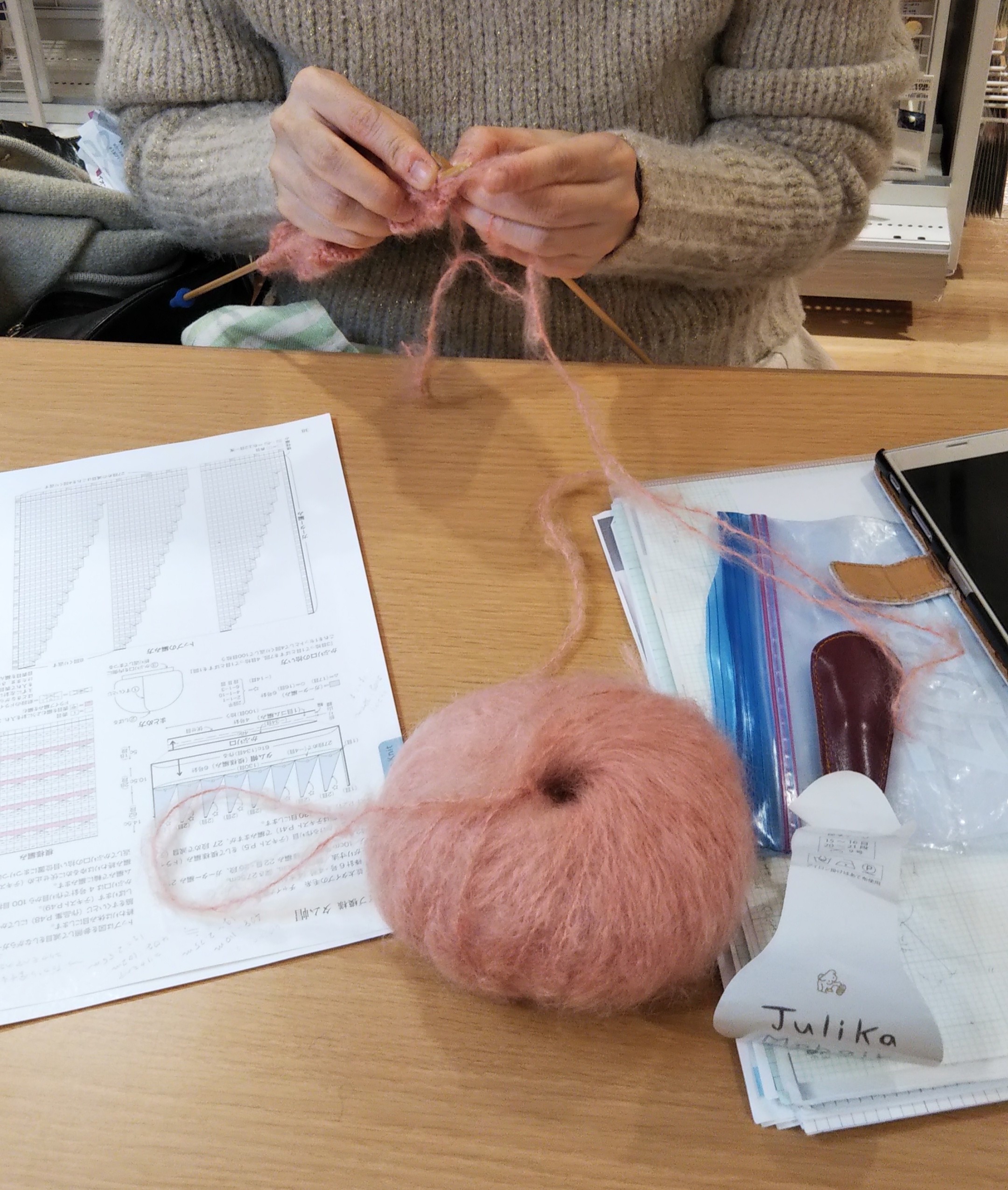 午前の部のお方は、サマーヤーンのVネックヴェストを制作中でして、