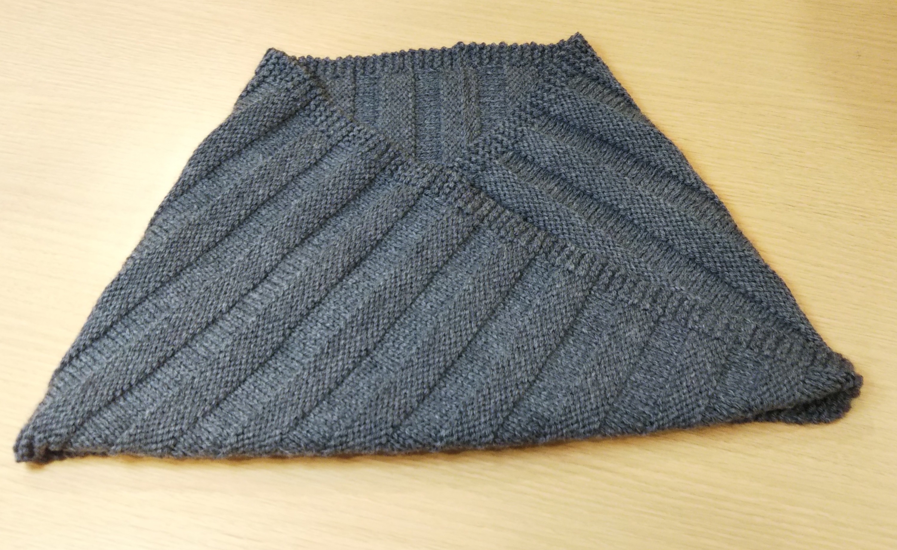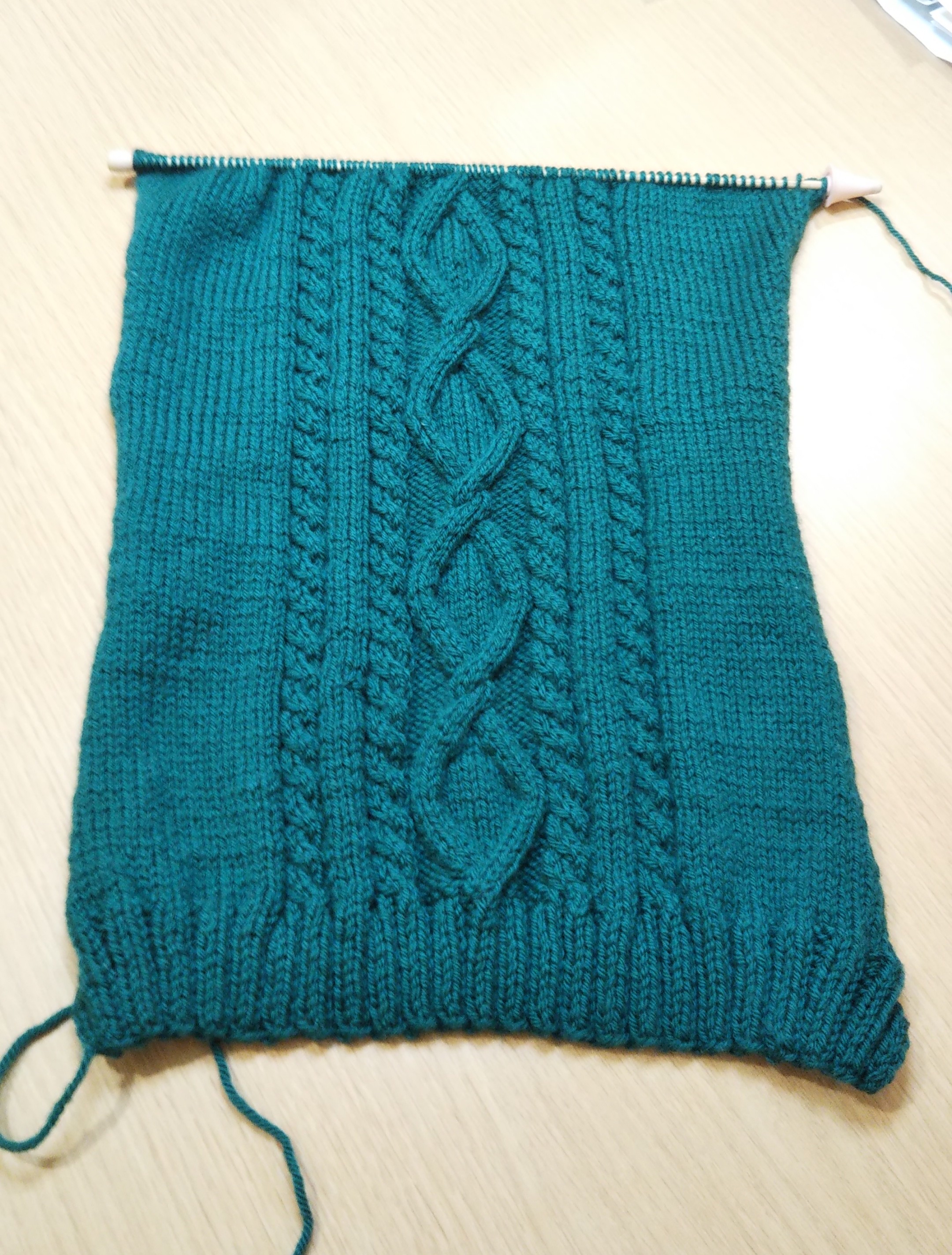 前後の身頃でゲージが違う(後ろ身頃はメリヤス編み、前身頃は編み込み模様)ので