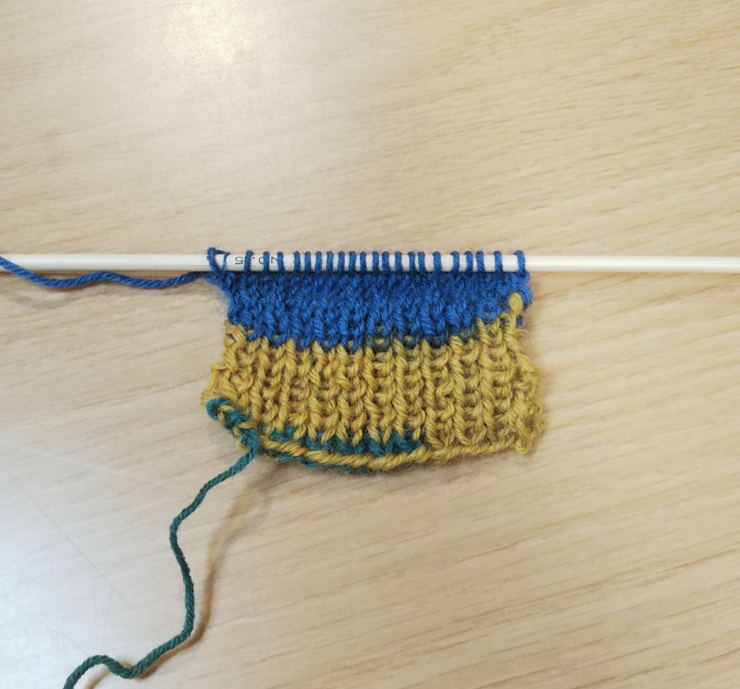 いろんな色が入っている段染めのソックヤーンなので、