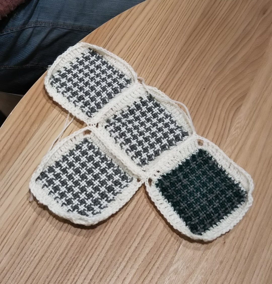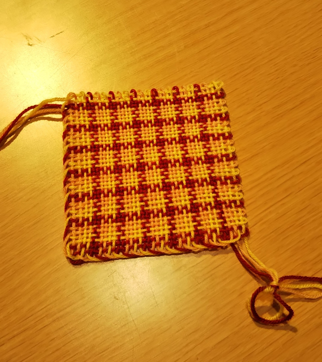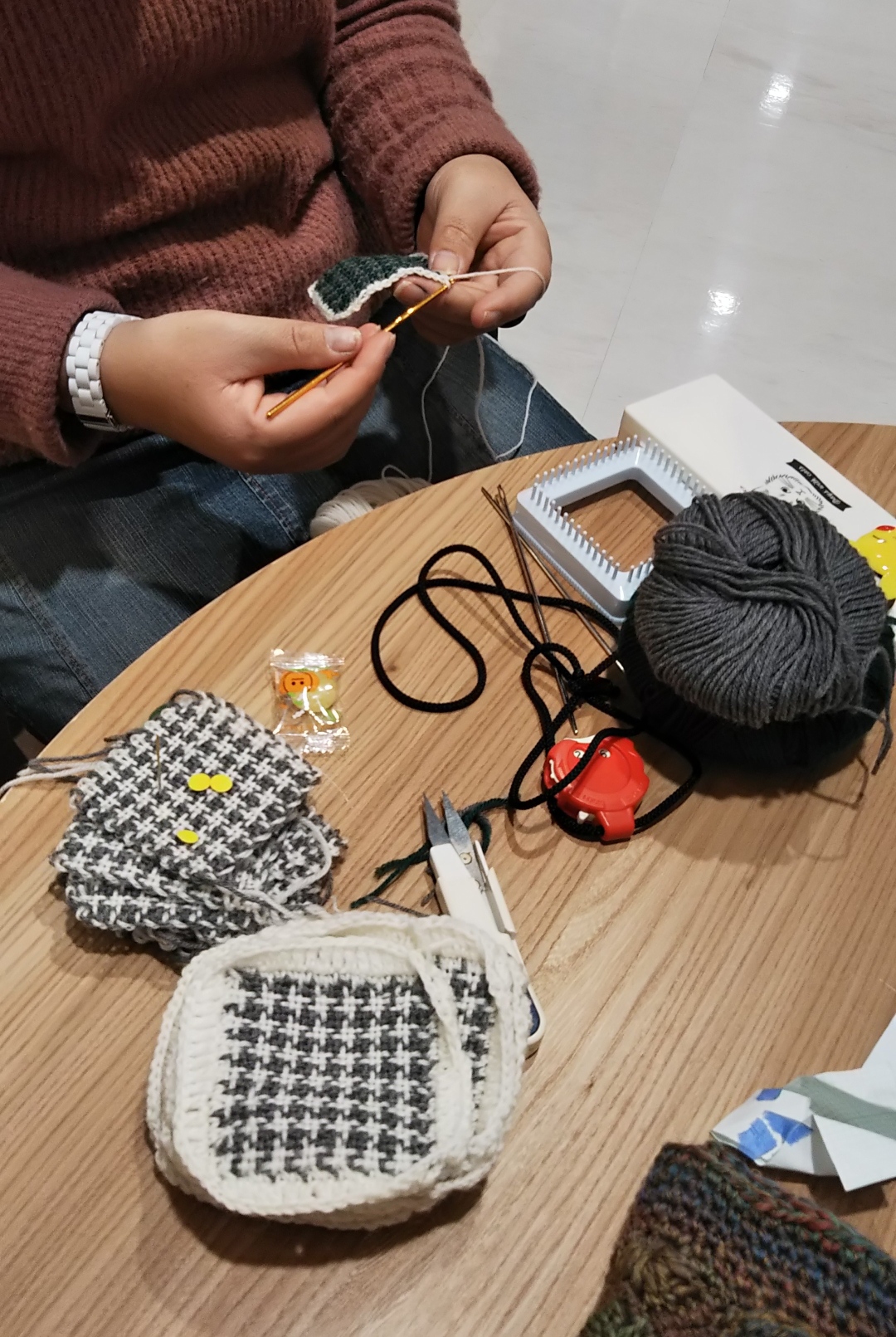 ヂヤンテイ織り器で千鳥格子を織ったり、