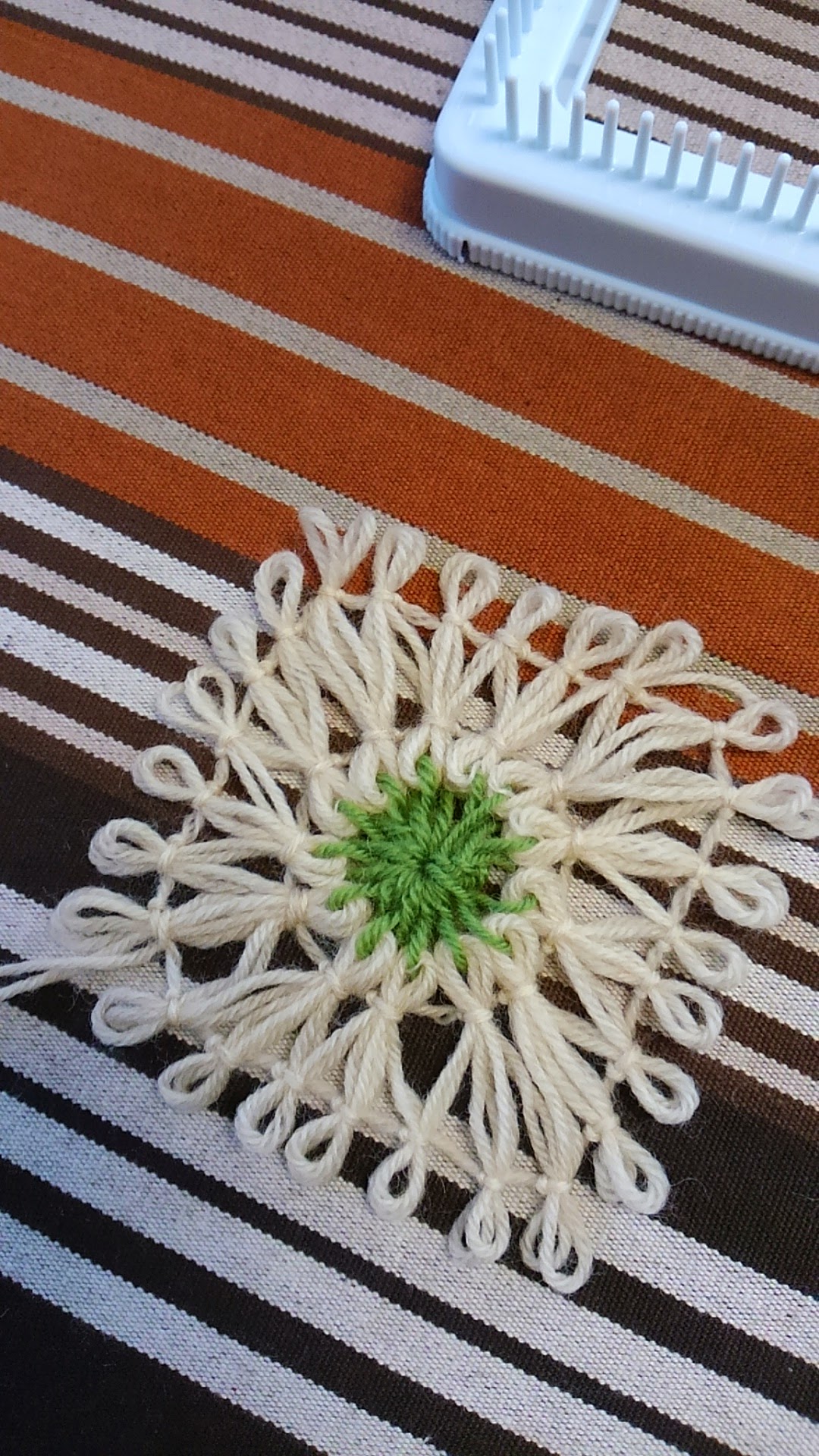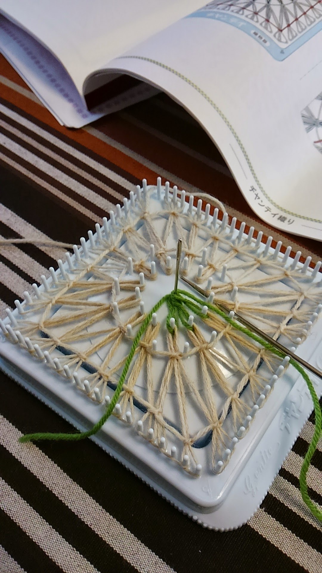 ( 織り機の内側にとじ針を立て、別の糸をかけます)