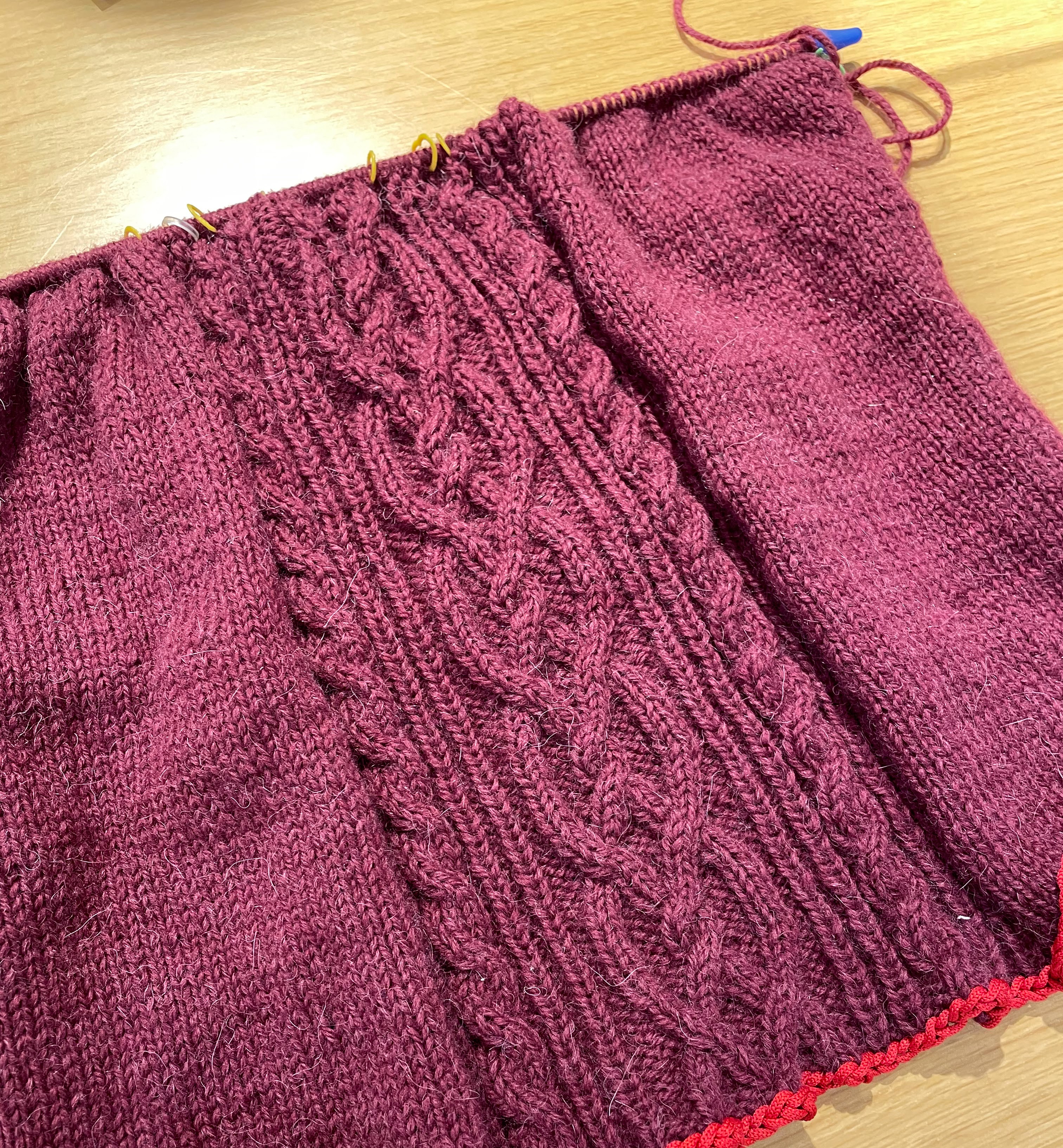 これから左右の袖ぐりでは減目、中央は複雑な交差模様…と