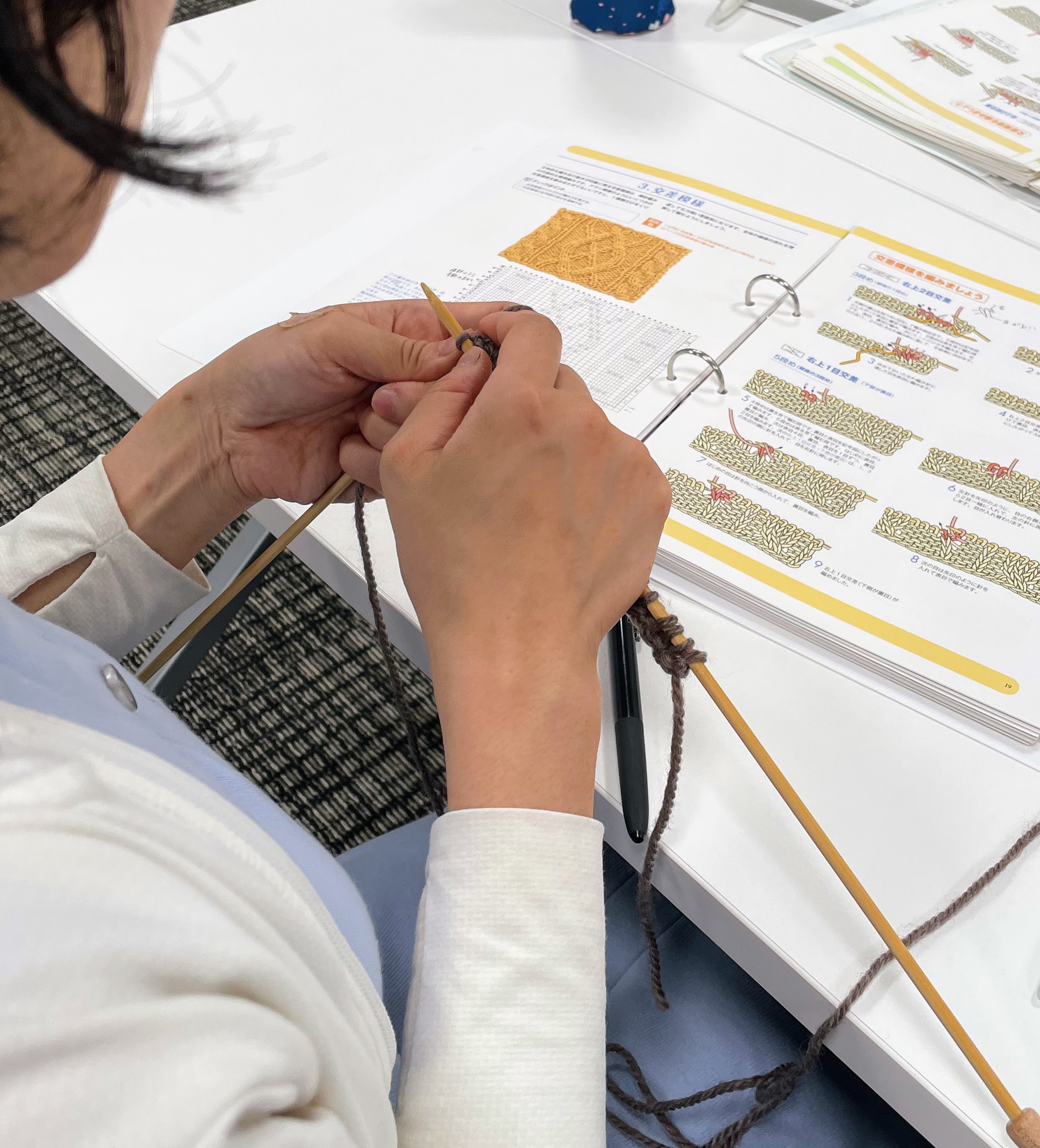 その後は、縄編み針も使って交差模様を編み進めてくださいました。