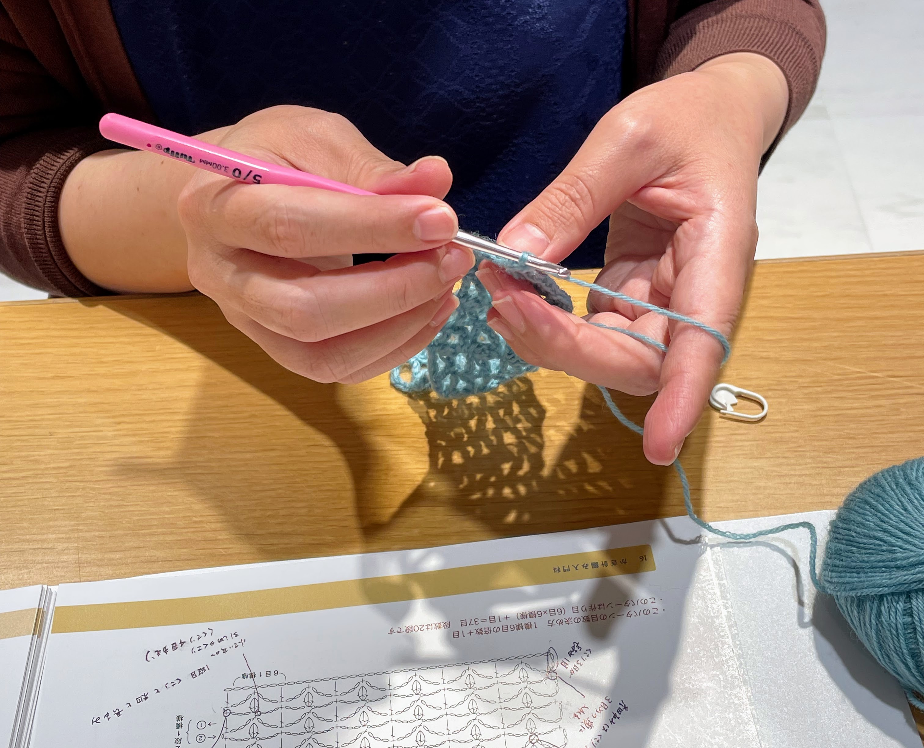 その後は、カリキュラム最初のテーマ・方眼編みの模様に取り組んでいただきました