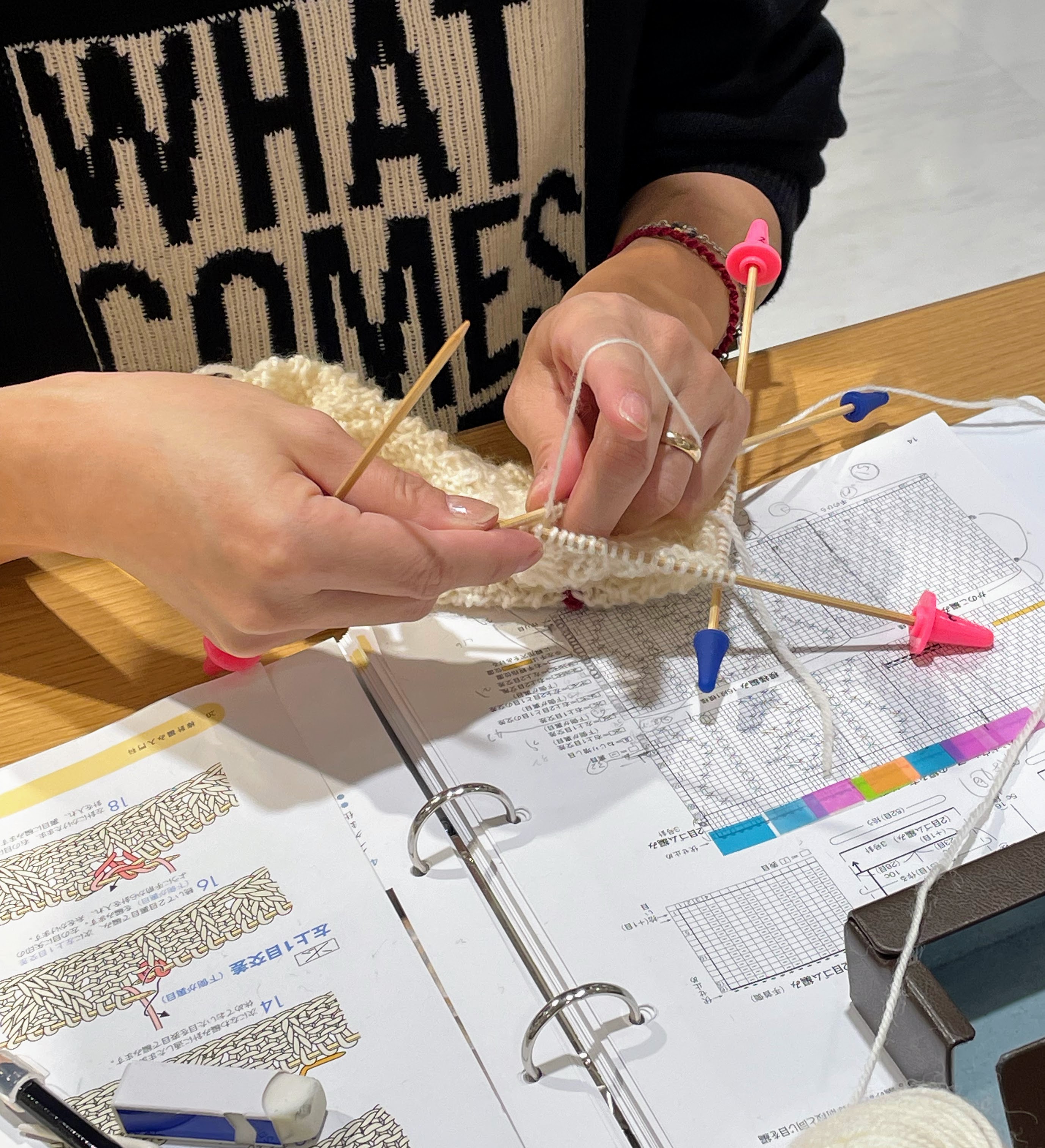 現在は小物課題のハンドウォーマーを編んでいらっしゃいます。