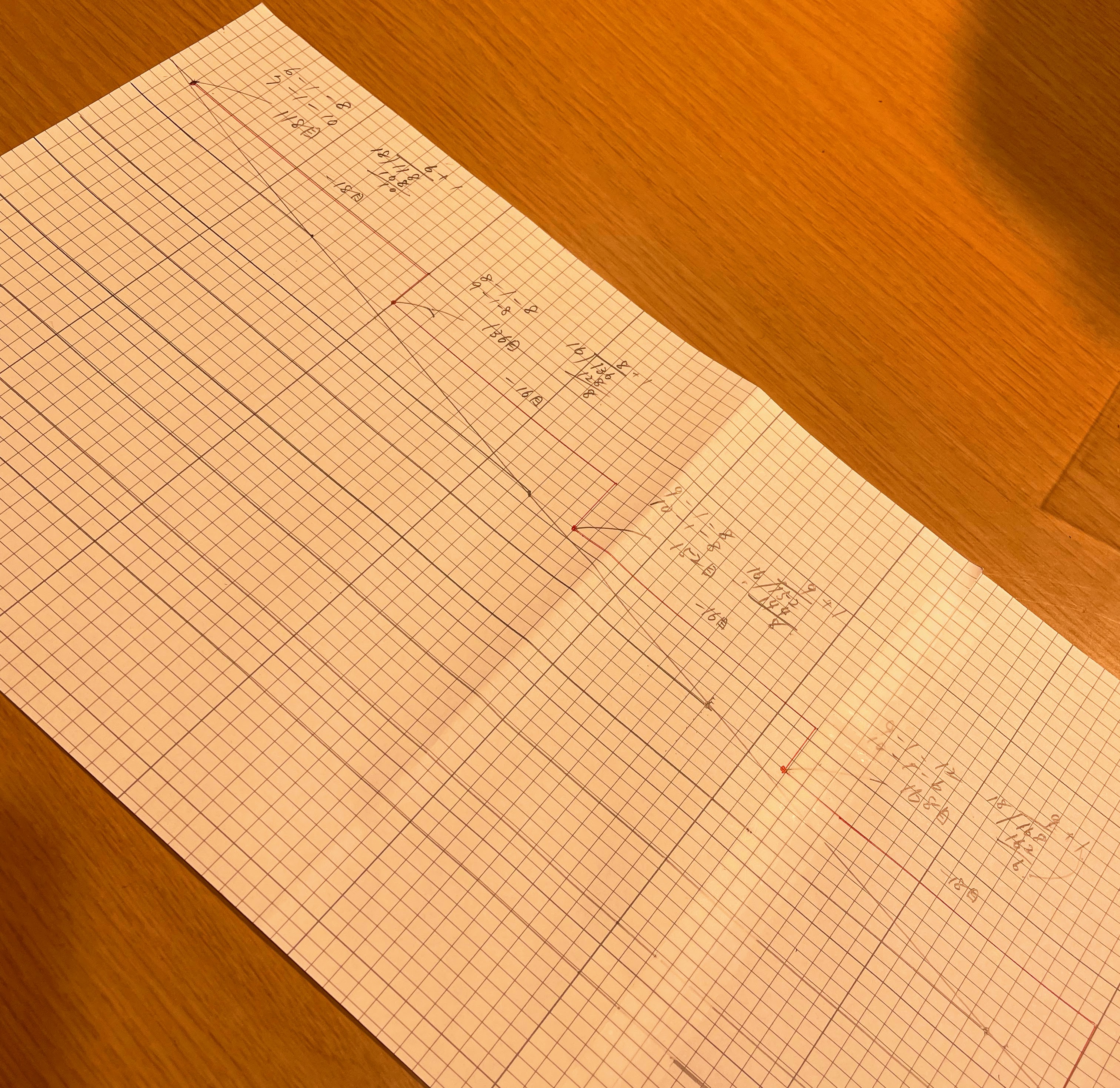 そしてそれを方眼紙に書き写し(例えば40段で150目減など)