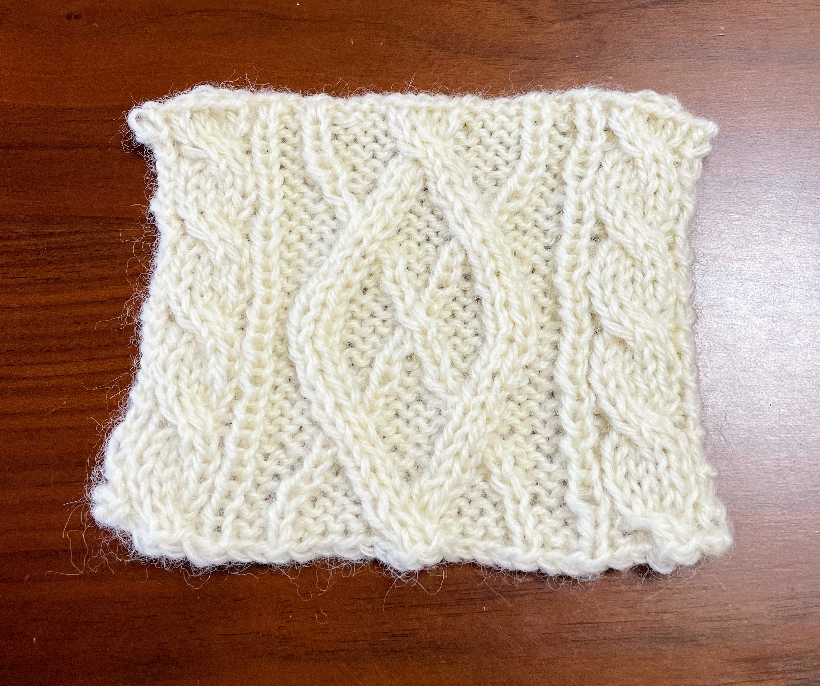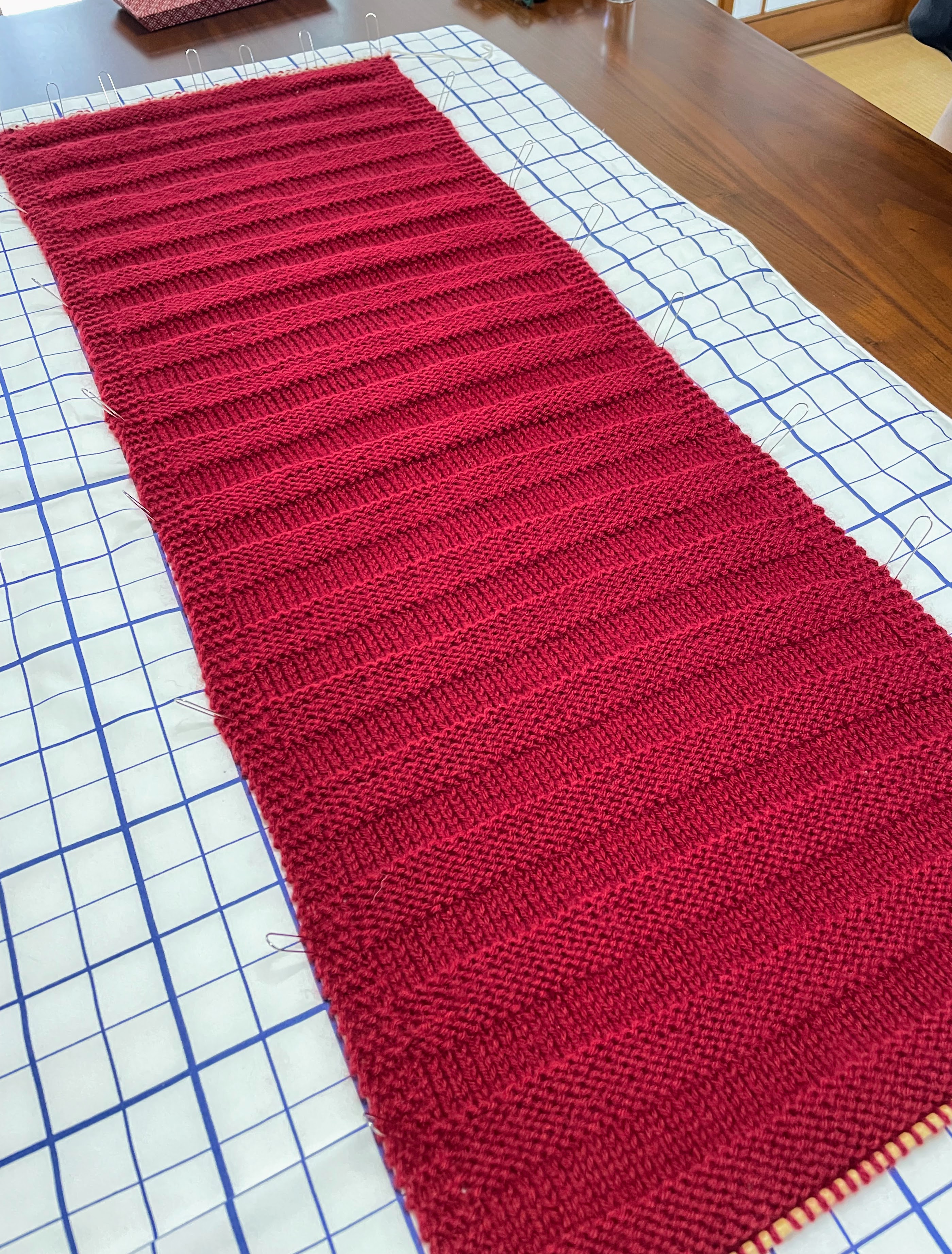 (ゴム編みを終え、すべり目の模様を編んでいらっしゃいます)