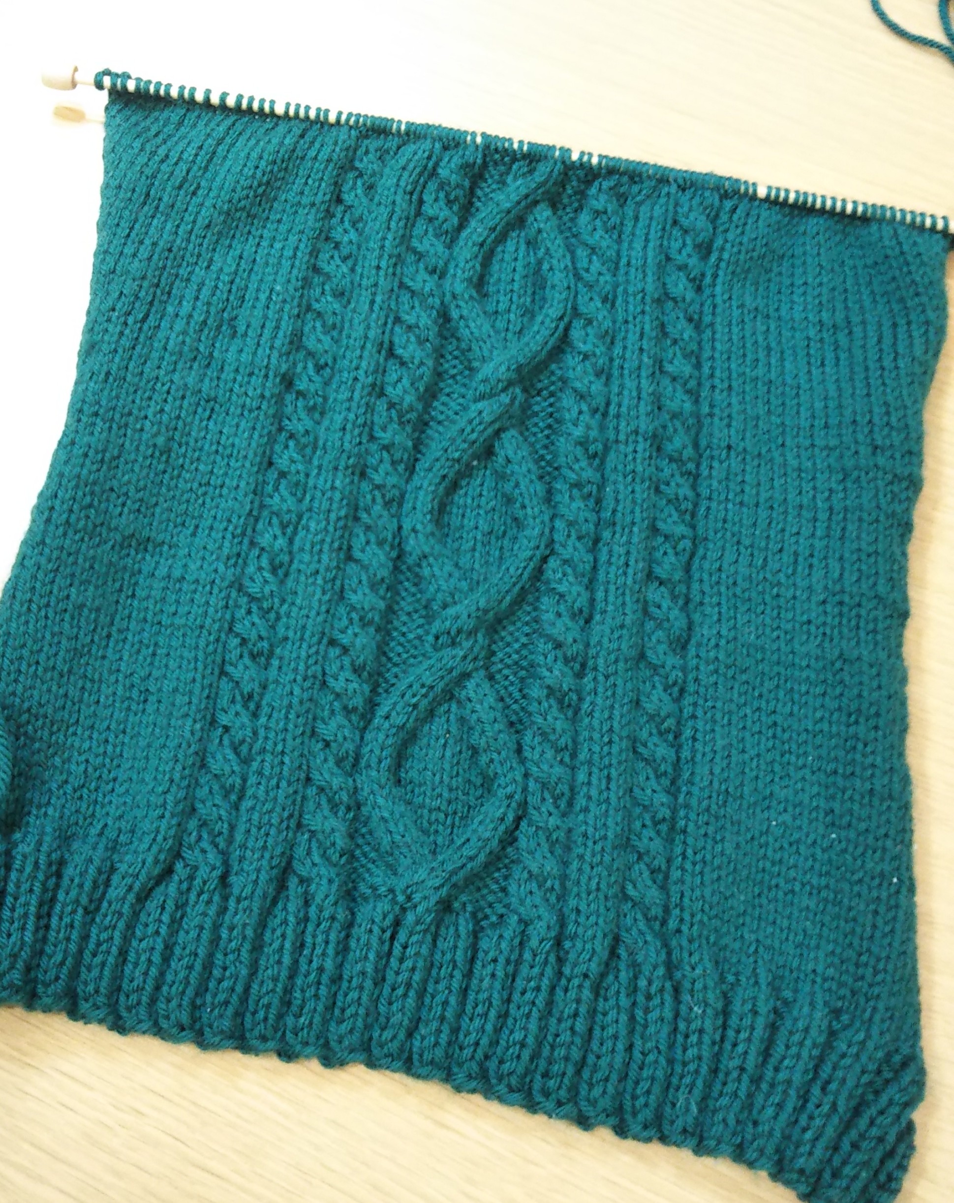 大ぶりな縄編みの入った身頃を編んでいらっしゃるのですが