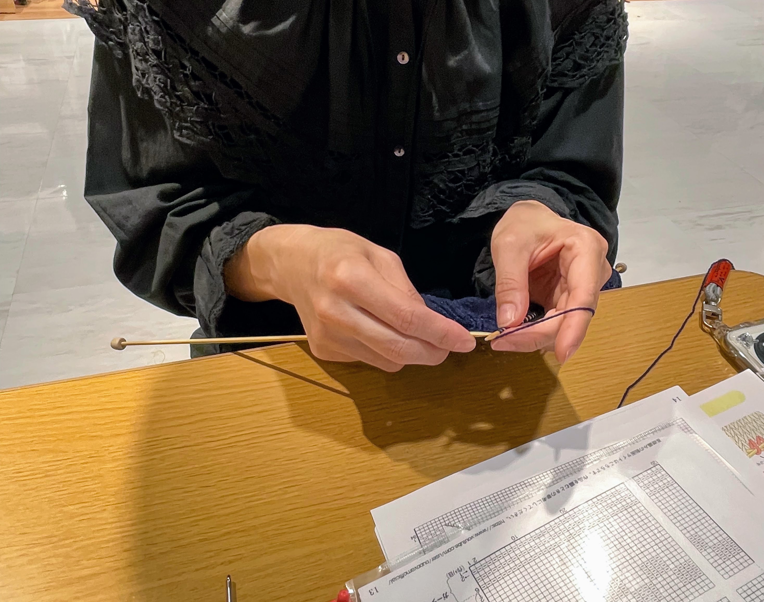 地糸が下、配色糸が上になるように糸を替えながら編んでいただきました。