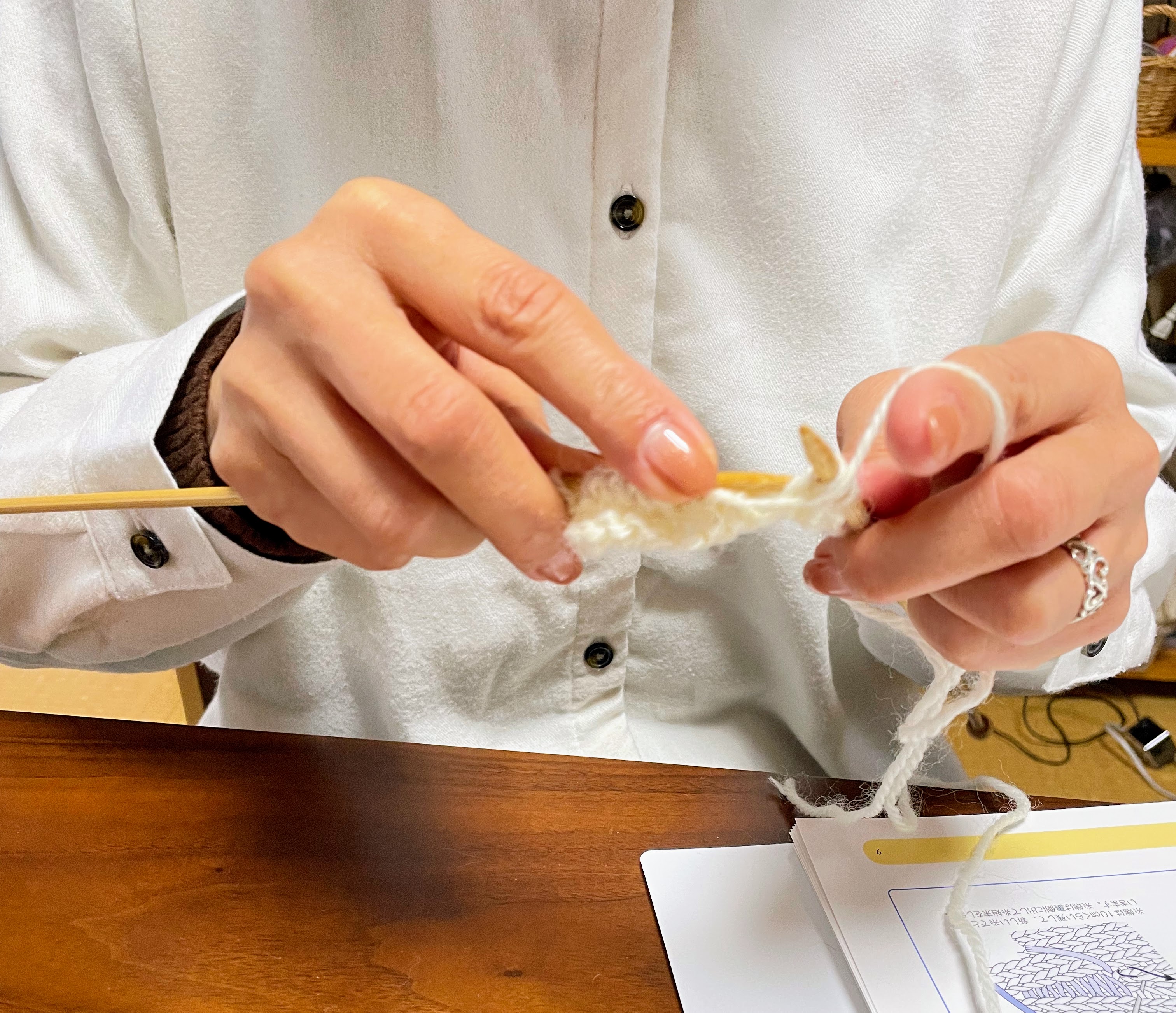 次のテーマのノット編みの模様に取り掛かっていただきました。