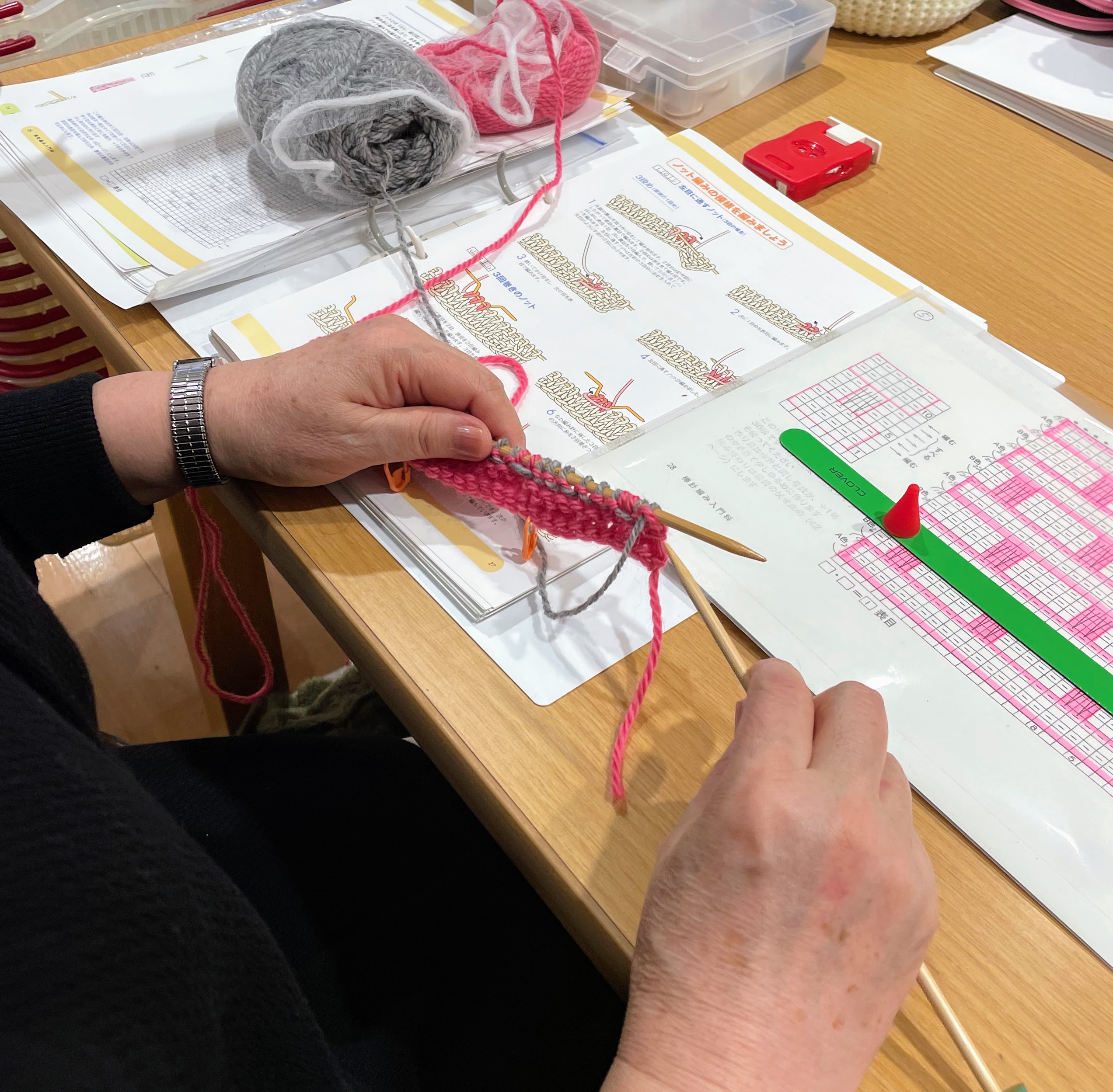 ノット編みの模様、すべり目の模様と立て続けに取り組んでくださいましたよー