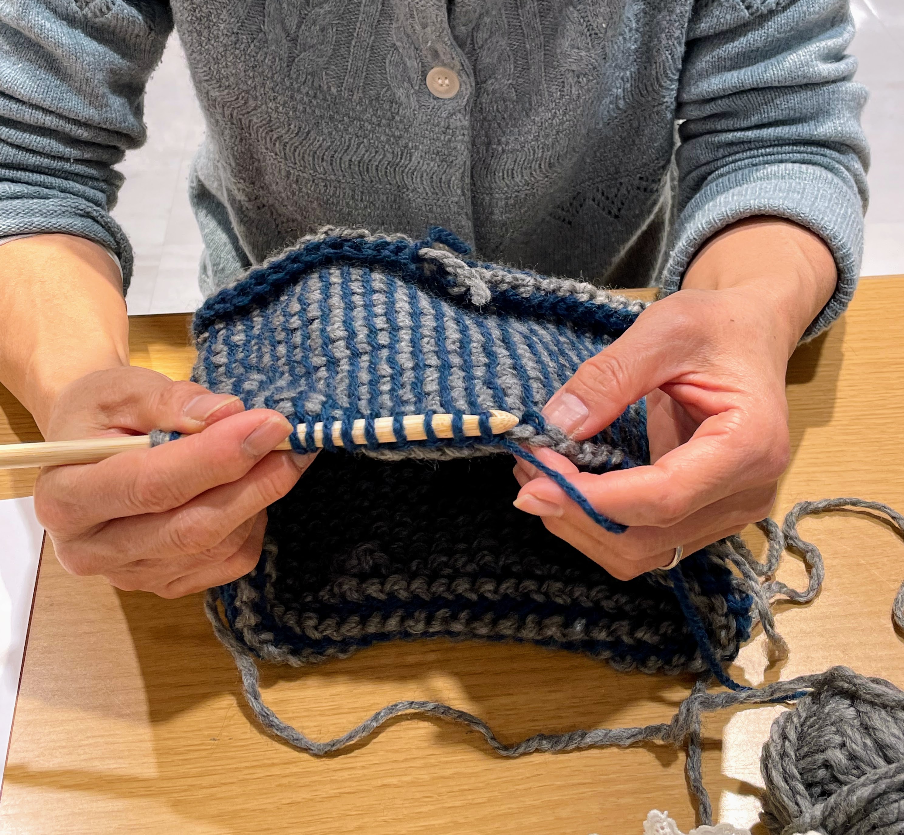 その後は小物課題の交差模様のハンドウォーマーに